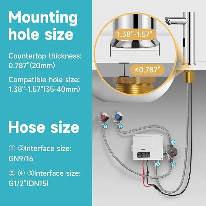 Bateria cu senzor AIKE este concepută pentru montare pe suport punte, potrivită pentru majoritatea chiuvetelor standard cu grosime sub 20 mm și orificiu între 35-40 mm diametru. Furtunurile de alimentare și conectarea respectă standarde comune (GN1/2), asigurând compatibilitate extinsă. Alimentarea cu 4 baterii AA permite instalarea oriunde, fără dependență de surse electrice.