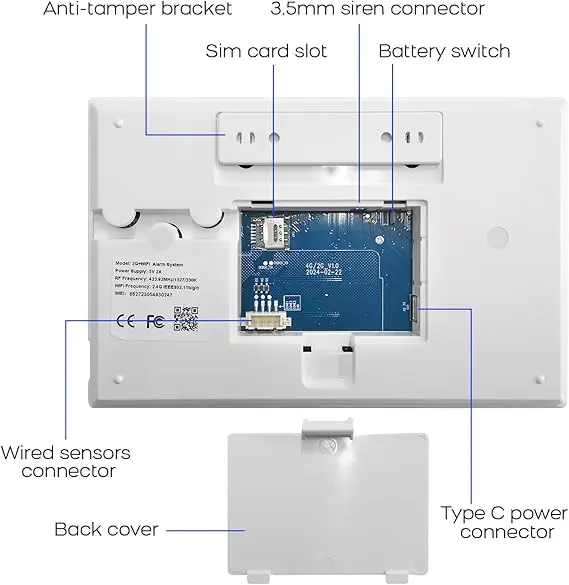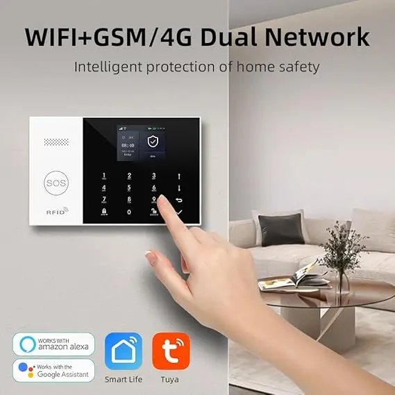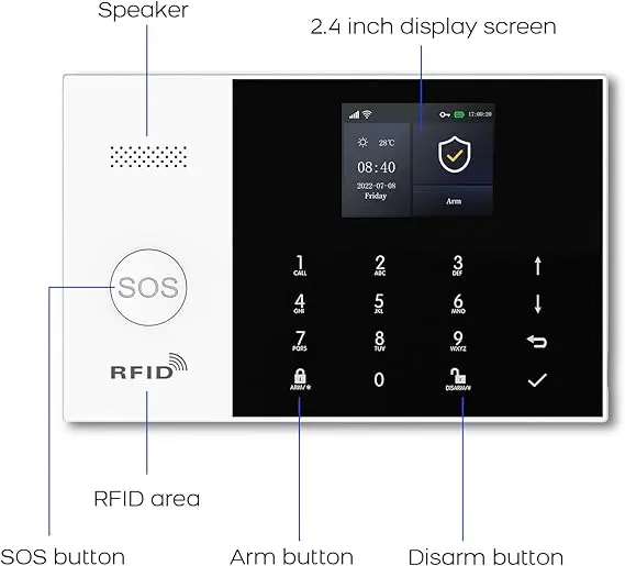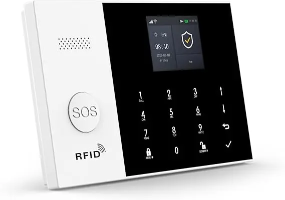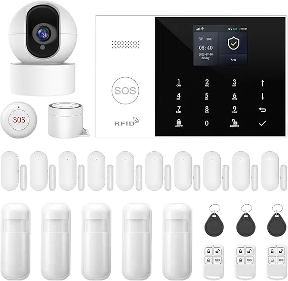 Instalarea sistemului se realizează rapid: alarma principală se fixează pe perete folosind șuruburile incluse și se conectează la sursa de curent. Bateria de rezervă asigură funcționarea timp de până la 8 ore în cazul unei pene de curent. Sistemul suportă extinderea cu până la 100 accesorii, inclusiv senzori PIR pentru mișcare, senzori pentru uși și ferestre, telecomenzi și carduri RFID, adaptându-se astfel nevoilor specifice ale locuinței.